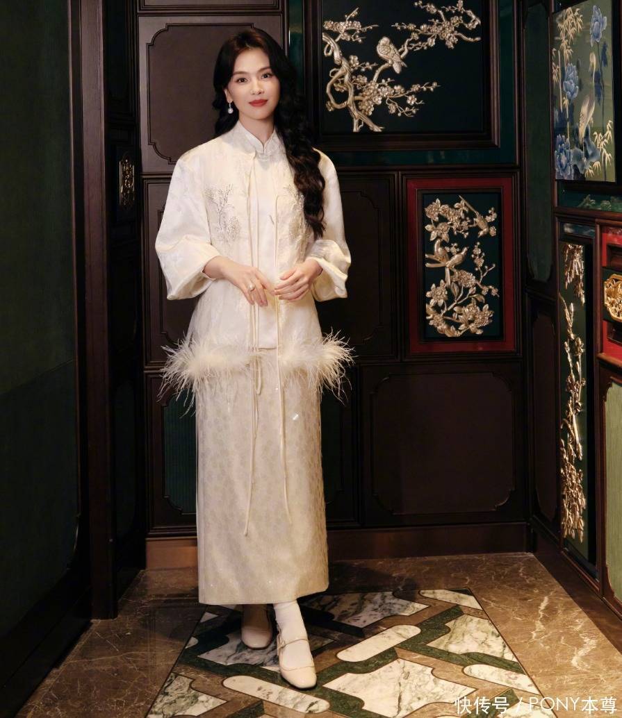 下半身搭配同色系半身裙,整体看起来日常穿也毫无违和感!不得不说,古典气息十足的刘涛穿新中式套装,美的很出众!
